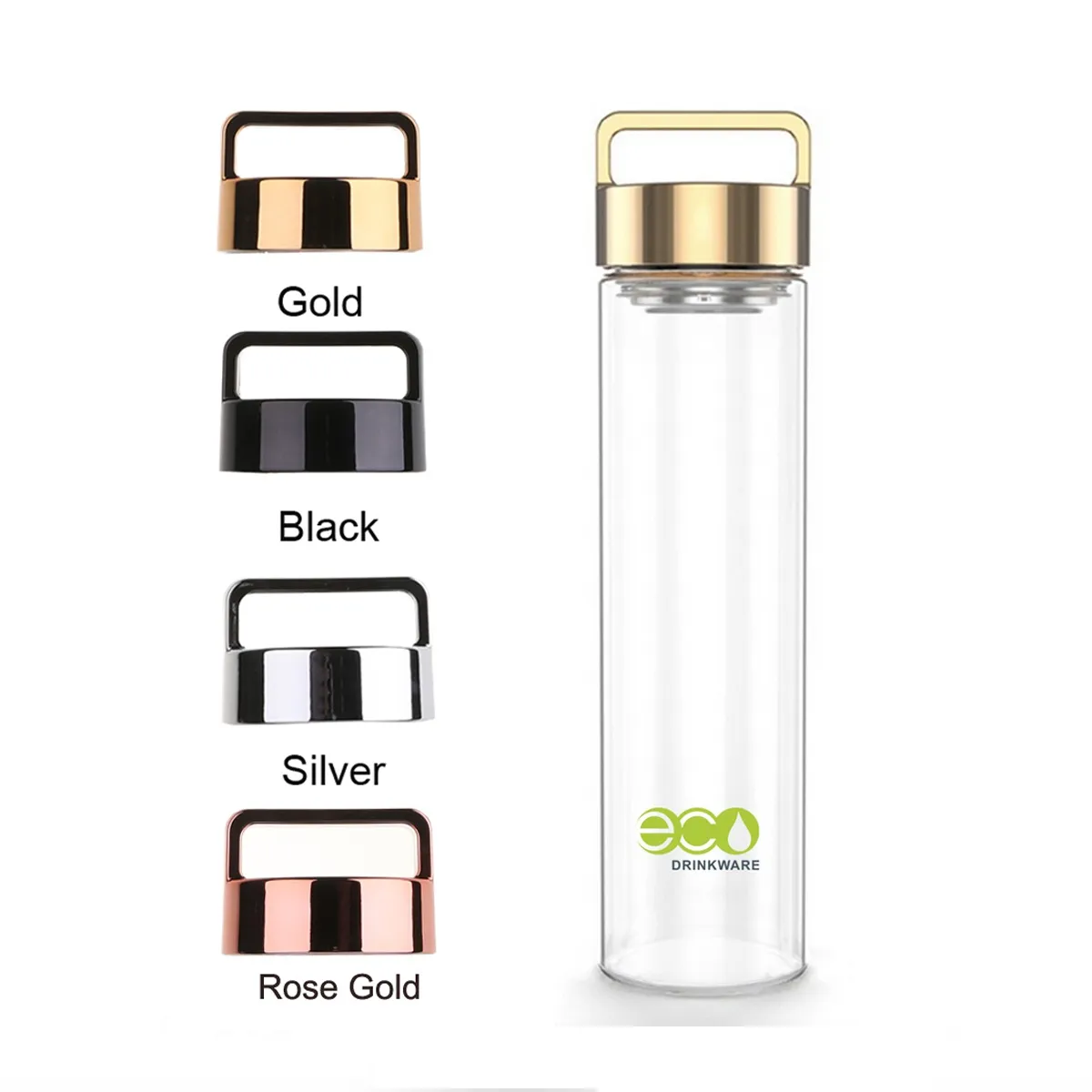 4 colores de tapas para la botella de vidrio para beber, la tapa es con asa, fácil de sacar. Con 304 de acero inoxidable interior de la tapa, el material de contacto con el agua es de calidad alimentaria.